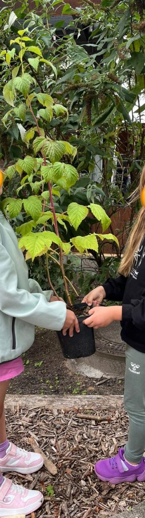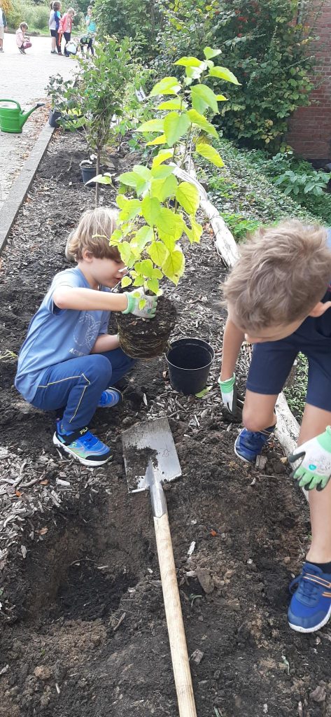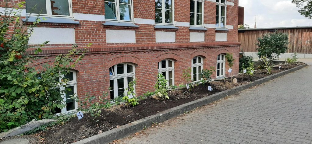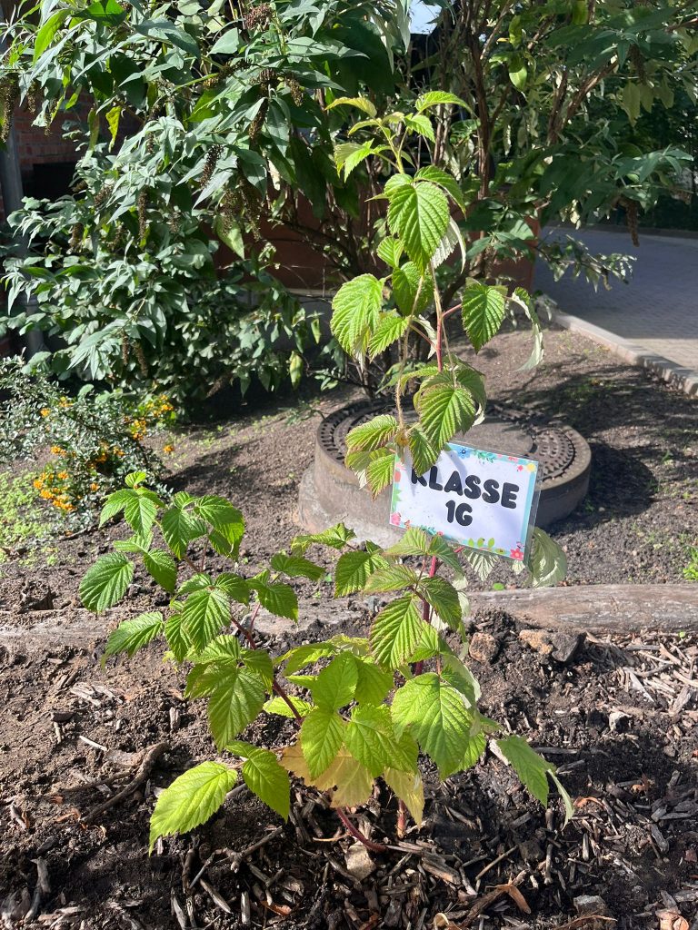 Große Freude auf dem Schulhof der Schule. Neben Wildnisstationen, Grillstand und Fotobox wurde heute zur Pflanzaktion gebeten. Jeweils 2 Kinder einer Klasse, sowie einer polnischen Patenklasse, pflanzten einen Obststrauch in das leere Holzhächselbeet direkt am Schulgebäude. Einige pflanzten aufgeregt zum 1.Mal etwas, andere waren schon Profis und wussten genau, wozu die Komposterde bereit lag. Das große Naschbeet wird in den nächsten Jahren die Schüler mit den verschiedensten Beeren erfreuen, von Sanddorn und Aronia, über Maulbeere bis hin zu den wohlbekannten Himbeeren und Johannisbeeren dürfte für jeden Geschmack etwas dabei sein. Jede Klasse wird in Zukunft ein Auge auf ihre „Patenpflanze“ haben. Das Beet ist noch nicht fertig, soviel sei schon mal verraten, bunte Farbtupfer im Frühling sind geplant!