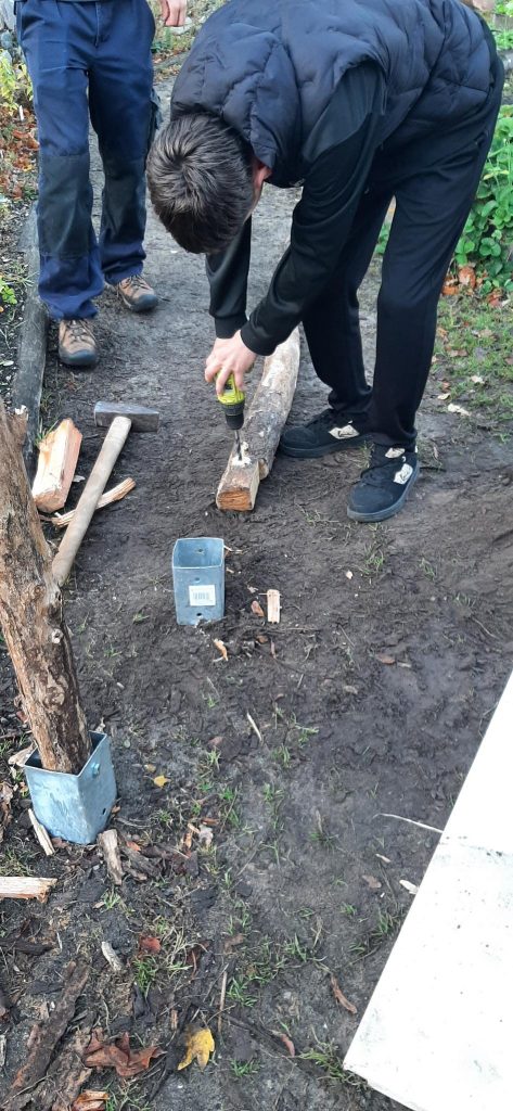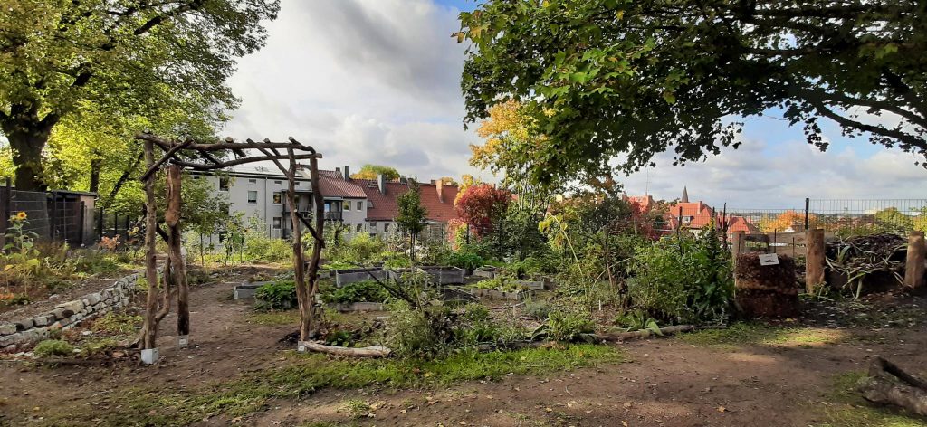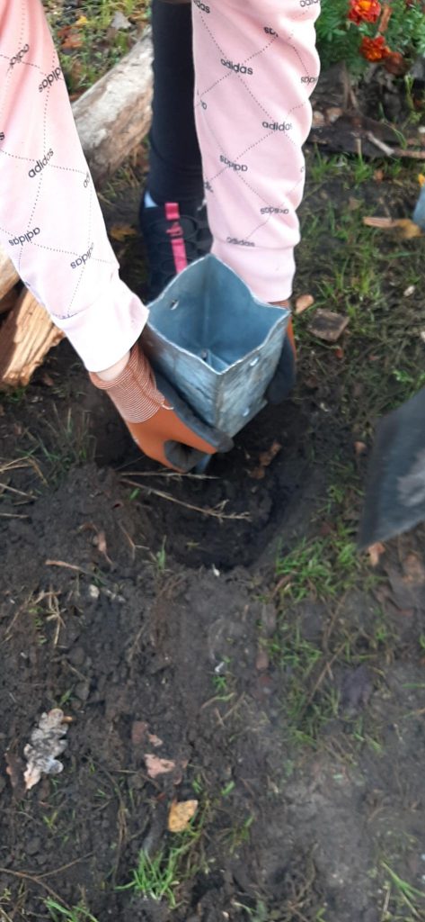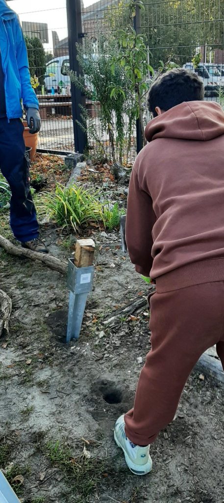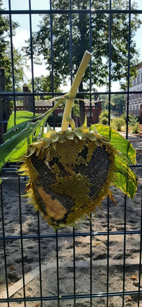 An diesem Donnerstag startete die Klasse 6k mit dem Bau einer kleinen Pergola. Diese soll ein Eingangstor zum Garten darstellen und als Kletterhilfe für eine Kiwipflanze dienen. Wer sich traute, schlug mit einem Vorschlaghammer auf die Bodeneinschlaghülse, eine anstrengendere Version von „Hau den Lukas“. Immerhin ist schon ein Baufortschritt zu sehen, am nächsten Donnerstag geht es damit weiter. Waren Kinder nicht gerade mit Hämmern beschäftigt, kümmerten sie sich um das Erdbeerbeet, pflanzten und pflegten die neuen Jungpflanzen. Alte Beete wurden geräumt und diverse Saaten ausgebracht, die den Winter über stehen bleiben können oder genascht werden dürfen, wie Spinat, Feldsalat und Winterpostelein. Apropos naschen: statt Vögel hingen jede Menge Schüler an den großen Köpfen der Sonnenblumen und pickten sich die reifen Samen heraus. Auch die kleinen Röschen vom Rosenkohl schmecken roh ganz lecker, genau wie der Kohlrabi, der nun abgeerntet wird. Am Unterstand darf im nächsten Jahr eine Weinrebe wachsen, die vorerst in einen großen Topf gezogen ist. 3 Mädchen bauten aus Gewindestangen und Draht einen einfachen Laubkompost, mit einer kleinen Öffnung am unteren Rand, vorbeispazierende Igel sind herzlich für den Winter eingeladen!
