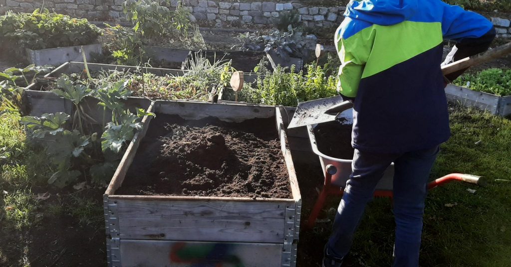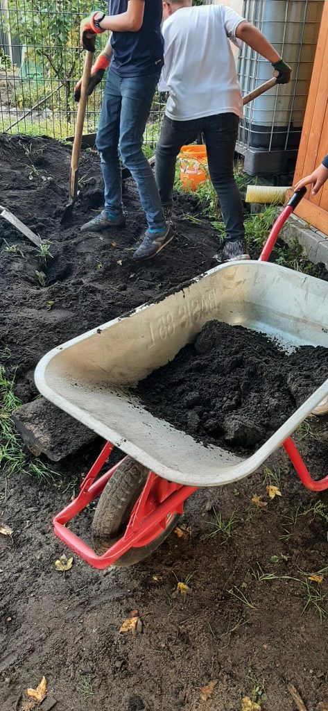 Am 19.9.25 findet das kleine Pflanzfest statt. Jede Klasse wird in einem freien Beet ein Obstgehölz pflanzen und somit am neuen Naschbeet auf dem Pausenhof beteiligt sein. Um den Pflanzen einen guten Start zu ermöglichen, wurden mehrere Schubkarren mit Komposterde gefüllt und (ähnlich wie die Bauarbeiter noch aktuell auf dem Hof) zum zukünftigen Beet gebracht.