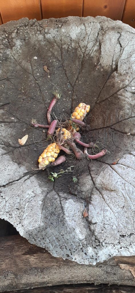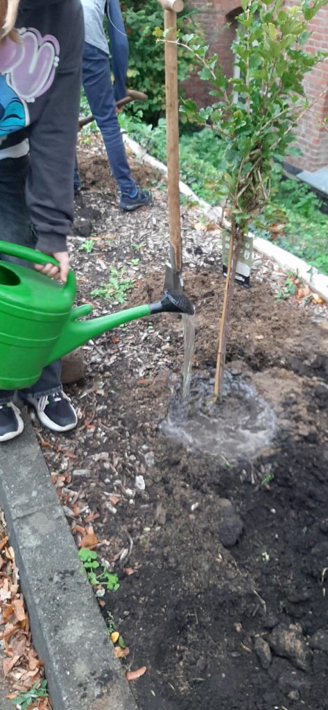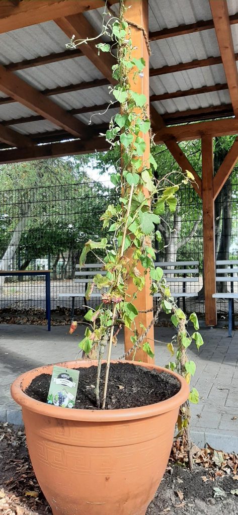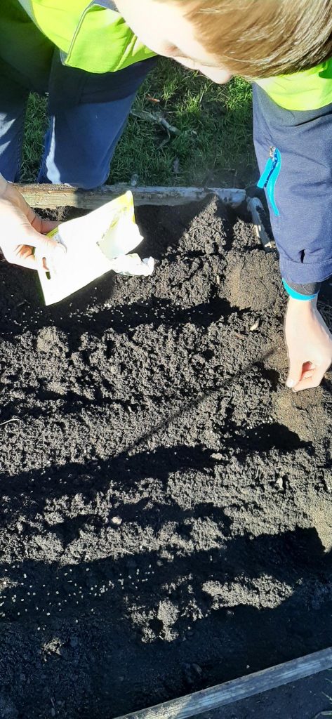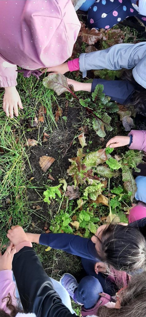 Die Pergola wurde von kräftigen Händen fertig gebaut, hier gab es das Problem, dass eine Bodeneinschlaghülse wieder entfernt werden musste, aber mit erstaunlicher Ausdauer haben die Kinder das Problem gelöst! Im Anschluss konnte endlich die Kiwi gepflanzt werden. Einem Mädchen fiel sogleich die Ähnlichkeit mit einem verwunschenen Portal auf, mal schauen, wo es uns hinführen wird! In der Hofpause wurden Salat- und Schnittlauchbeete „geplündert“, schön, wenn Gesundes so heiß begehrt ist. Weitere Winteraussaaten wurden getätigt, sowie Knoblauch und Steckzwiebeln gesetzt. Ein paar Gemüsereste haben wir übrigens als Test ausgelegt, ob sie wohl von tierischen Bewohnern stibitzt werden?